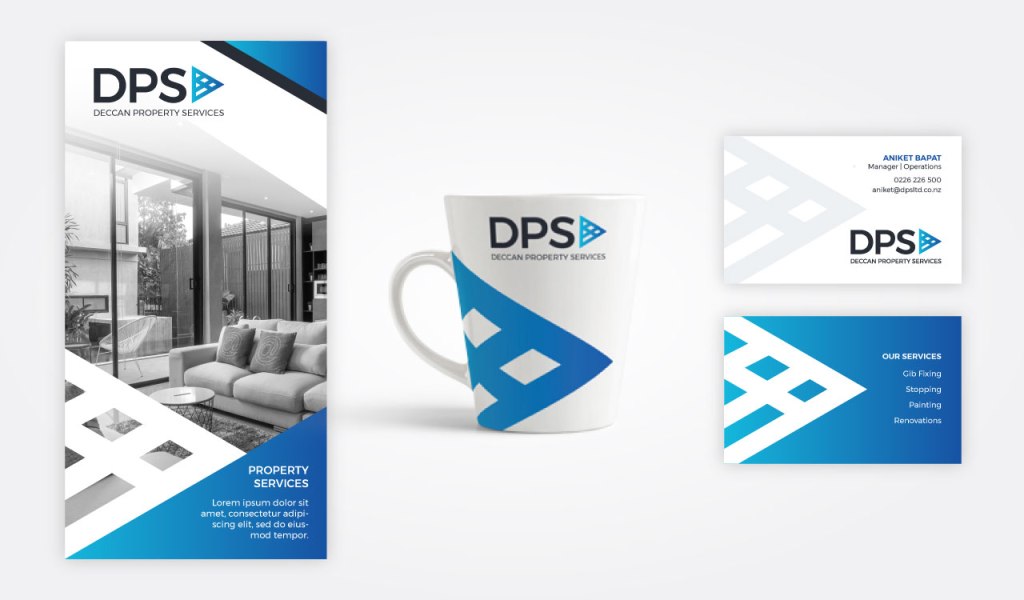 This company is a startup that offers mid range interior and painting services to residential and commercial properties. Their name, Deccan Property Services is a long one and has less memory value for their audience. Hence we made a conscious choice to create the main identity using the initials of the business name – DPS. I created a strong icon to reflect this and combine the visual aspects of the letters. This was done using strong shapes, geometric angles and crisp lines to capture the true essence of their work and functioning.