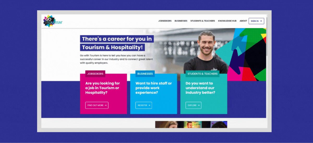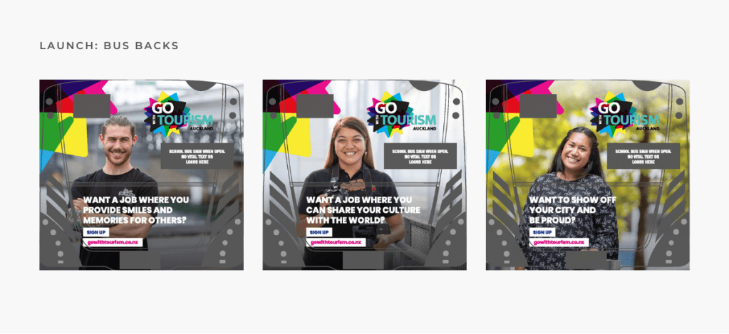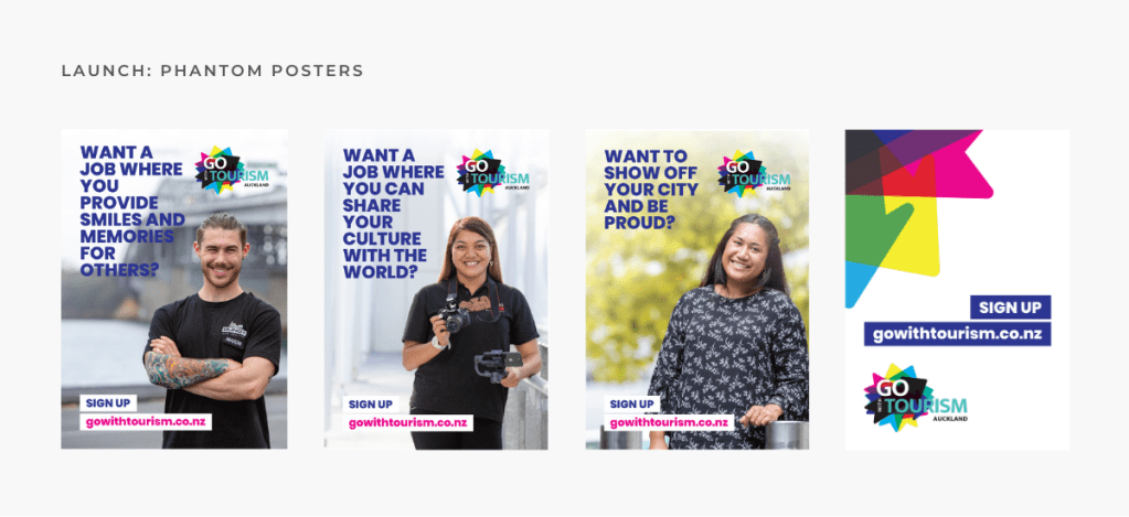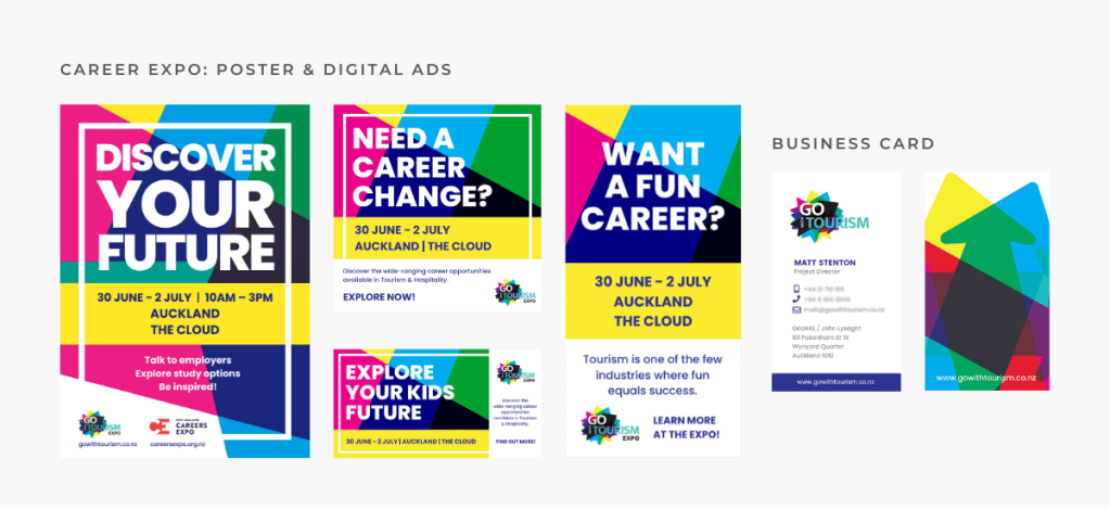 Go with Tourism is a unique initiative that specializes in growing New Zealand’s Tourism & Hospitality workforce. The main objectives are connecting talent with industry employers and getting Kiwis to think positively about the industry. I had the exciting opportunity to be part of this brand’s conception right from the start. Along with the client’s team and another third party designer, we coined the brand name, the logo and the entire visual language for the brand. This was followed by the website and digital marketing which we continue to support and enrich.