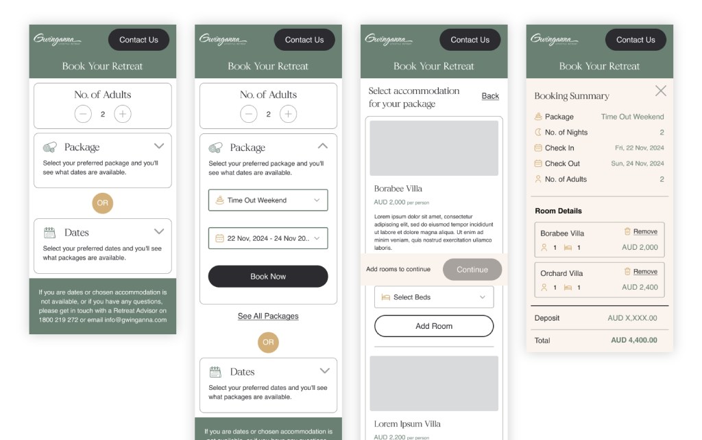 Gwinganna is a high end lifestyle retreat in Allebudgera Valley, Queensland, Australia. Their unique offerings and product structure meant that no existing online booking would work out for them as a plug and play widget. They hired us to resolve this problem by building a custom responsive booking flow for their products. The lifestyle retreats are available on fixed dates only and each one is a separate package that is pre-built. We came up with a funnel where at the top of the flow, the user first chooses between either choosing a specific package first, or a specific date. Depending on what is chosen, the next set of available products are displayed. The user is then guided into a seamless booking journey.